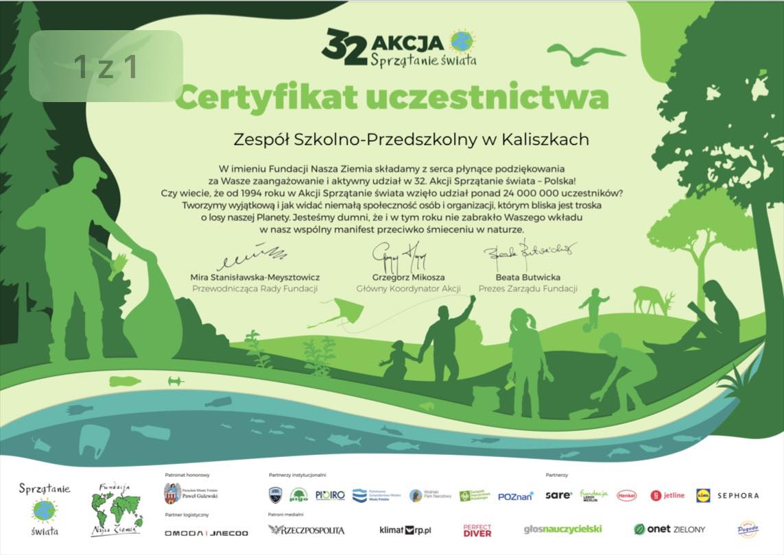 Nasza szkoła otrzymała certyfikat za ogromne zaangażowanie w 32. Akcję Sprzątanie świata - Polska!